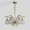 This elegant chandelier features striking curved shades made of clear striated glass, perfectly complemented by a warm brass frame. It is designed to add a sophisticated touch to your dining area or entryway.