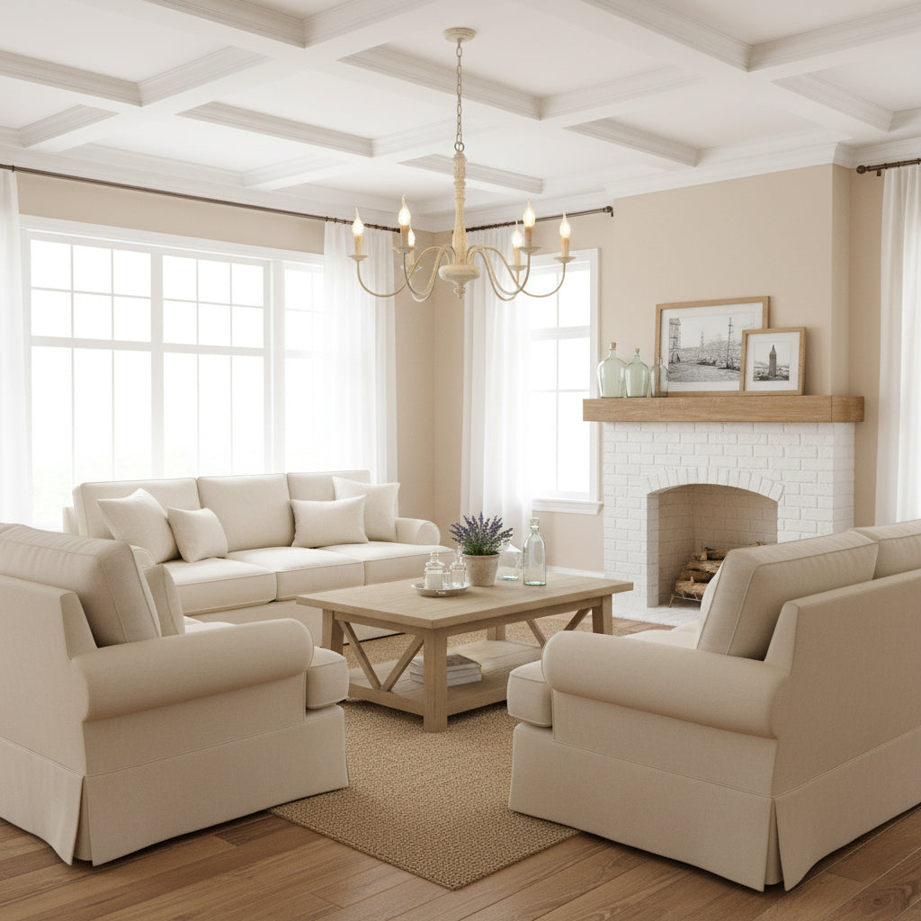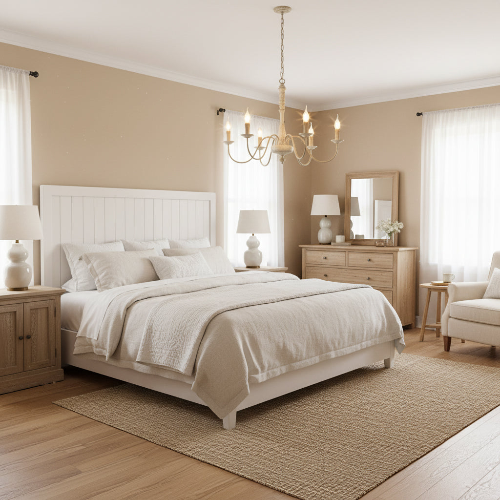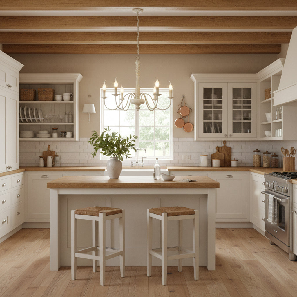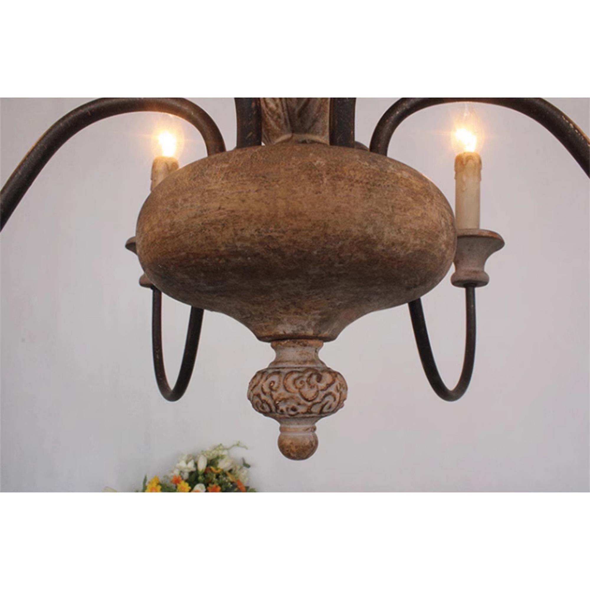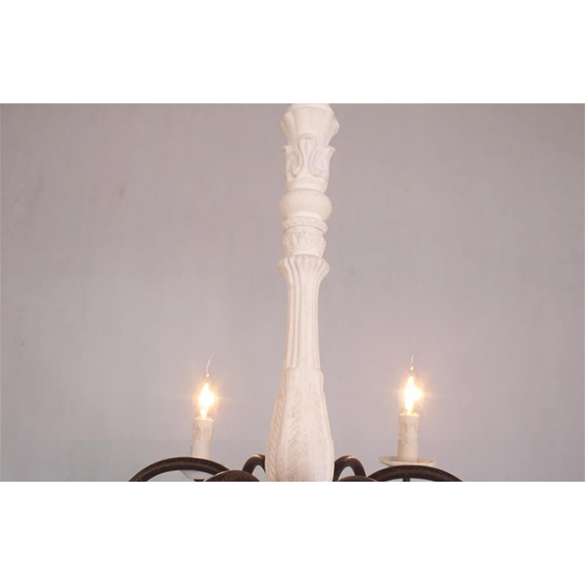 This 6-light French country rustic farmhouse chandelier makes an elegant addition to any home. It features six gracefully curved arms with vintage white accents extending from a solid wood center column to upward-facing candlesticks, bringing a classic French country charm to your interior space.