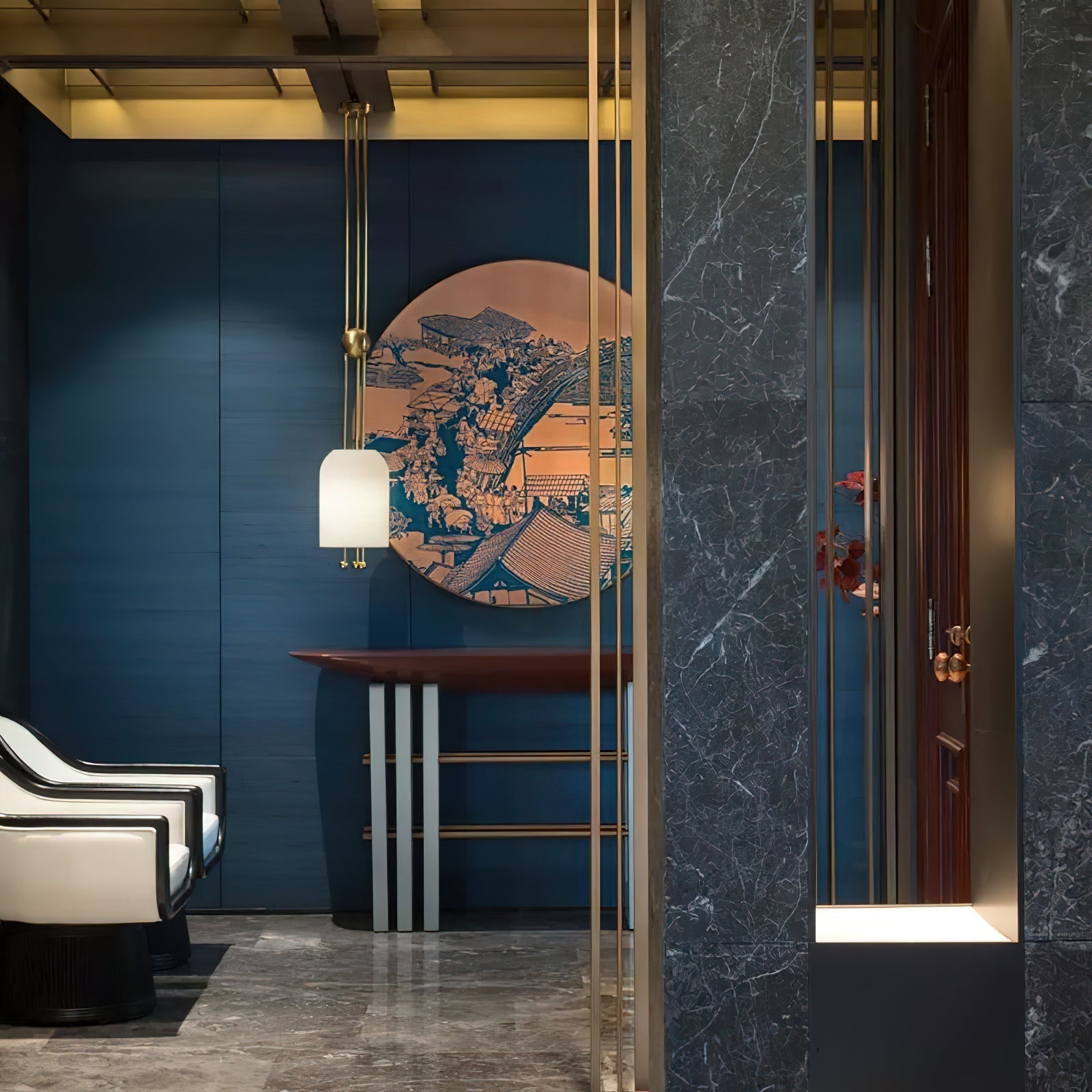 The THECARGOODS Lantern Pendant features elegant slip-glass forms gracefully suspended along a rigid metal structure. Finely incised fluting accentuates the light's glow, evoking the timeless essence of historical lanterns where light softly filters through a delicate, protective form. Repeating spherical elements provide a balanced visual counterpoint to the main shades.